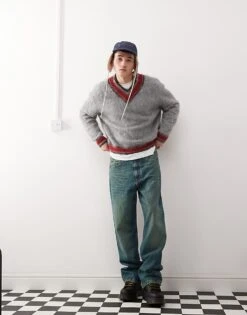 Reclaimed Vintage V-neck Varsity Jumper In Grey And Red For Men