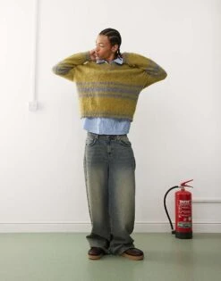 Reclaimed Vintage Varsity V-neck Jumper In Green And Grey For Men